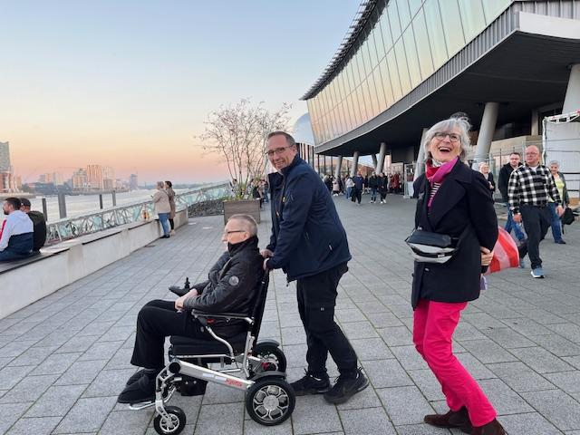 Besonders liebt er Musik. Früher sang er in verschiedenen Chören, erlebte das „Phantom der Oper“ am Broadway und kann es kaum erwarten, heute das Musical in Hamburg zu sehen. Gegen 14:00 Uhr erreichen wir den Parkplatz beim „König der Löwen“. Bettina ist bereits da und freut sich, ihren Onkel zu treffen. Das Wetter ist fantastisch und beschert uns eine herrliche Aussicht auf Hamburg mit der Elbphilharmonie, dem Michel und der Altstadt – ein rundum perfektes Bild.
