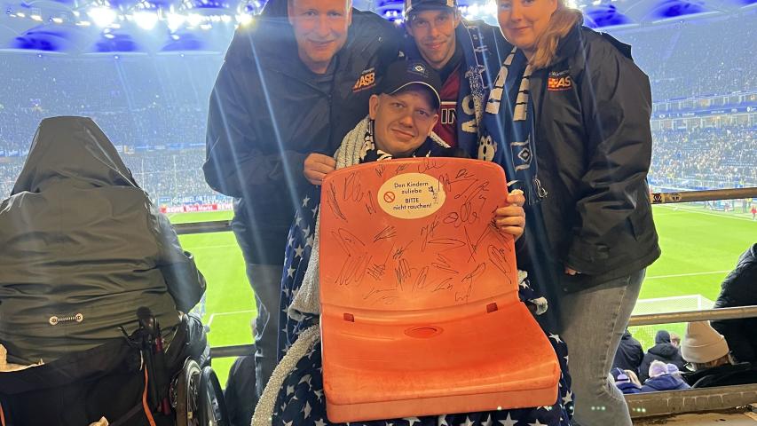 Dennis, eingefleischter HSV-Fan aus Bad Segeberg, hat sich schon die ganze Woche auf das ausverkaufte Spiel gegen die Borussen aus Dortmund gefreut. So machten sich die Wunscherfüller Alex und Lars auf den Weg nach Bad Segeberg, um mit Dennis und seinem Bruder Nils am Samstagnachmittag die Rothosen anzufeuern. Der Wünschewagen wurde natürlich mit HSV-Bettwäsche vorbereitet, sodass die Vorfreude auf ein tolles Spiel groß war. Vor dem Spiel wurden wir sehr nett von dem HSV-Integrationsteam empfangen. Dennis bekam einen Stadionsitz, der von allen Spielern des HSV signiert wurde. Eine tolle Erinnerung und ein tolles Geschenk! Dann der Anpfiff: Dennis und Nils feuerten kräftig, gestärkt nach einer Stadionbratwurst, ihren HSV an. Ein ausgeglichenes Spiel bis zur 64. Minute! Doch dann kassierte der HSV den Gegentreffer. Aber die HSV-Kicker hielten sich wacker und konnten in der 7. Nachspielminute der zweiten Halbzeit einen Ausgleich erzielen. Die Stimmung im Stadion und bei Dennis und Nils war dann natürlich überwältigend. Eine richtig tolle Atmosphäre! Mit diesem guten Gefühl machten wir uns nach dem Schlusspfiff auf den Rückweg nach Bad Segeberg. Sicher feierten die beiden Brüder dann noch den mehr als verdienten Ausgleich ihres HSV.