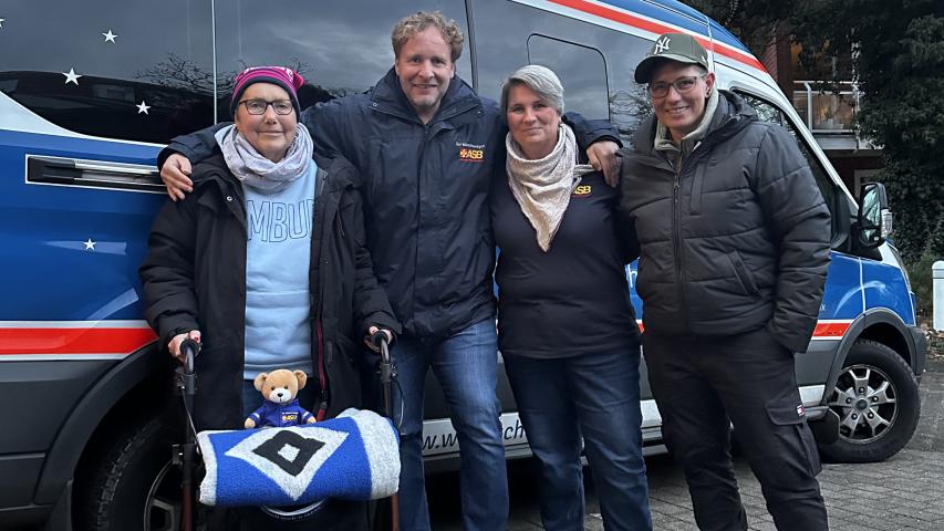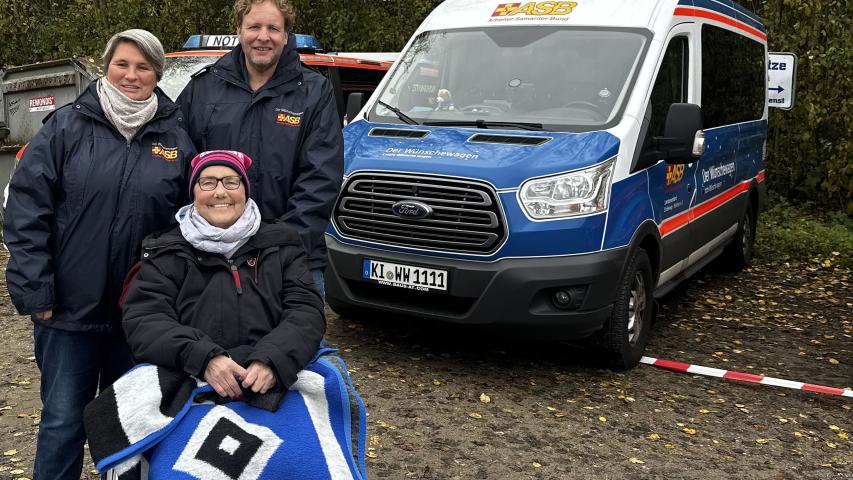 Diesen Wunsch hatte Conny auf dem Zettel. Ihre Tochter Mella kontaktierte das Wünschewagen-Team. Wie es der Zufall wollte, stand das Auswärtsspiel gegen Holstein Kiel am 11. November auf dem Spielplan des HSV – nicht weit entfernt also von dem Hospiz Haus Porsefeld in Rendsburg, in dem Conny wohnt. Von dort starteten die Wunscherfüller:in Manuela und Lars gemeinsam mit Conny und ihrer Tochter Mella in Richtung „Kieler Störche“. Conny hatte sich mit ihrer HSV-Fankluft so richtig in Schale geworfen, und ein kleines Spalier entließ sie aus dem Hospiz.